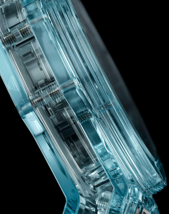 Housed inside the Water Blue sapphire case is the automatic MBHUB1280 UNICO 2 in-house made movement, a flyback chronograph caliber visible via the skeletonized dial, exhibition caseback, and, of course, partially through the sides of its translucent home. This automatic integrated chronograph movement with a column-wheel clutching system has 354 parts and 43 jewels, operates at 28,800 bph (4 Hz), and supplies 72 hours of power reserve. Water resistance is rated to 50 meters.