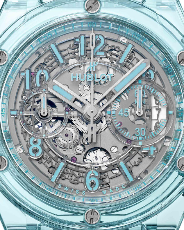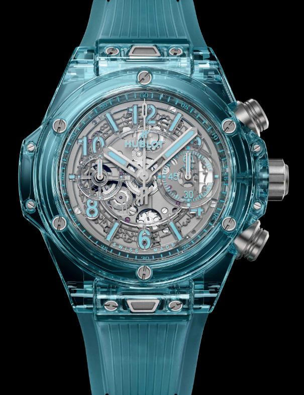 The translucent “Water Blue” sapphire case first made its debut in 2024 on the MP-11 watch, but this marks its first appearance in the more familiar Big Bang silhouette. The color brings a summery, oceanic vibe to the 44mm (14.5mm thick) case, constructed entirely from polished sapphire crystal, including the bezel and caseback. Creating sapphire in this particular tone and shaping it to perfect replica Hublot watches UK complex geometries remains one of the more technically demanding feats in modern case production.